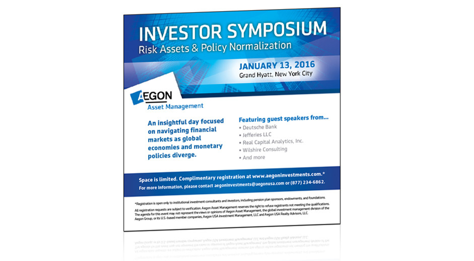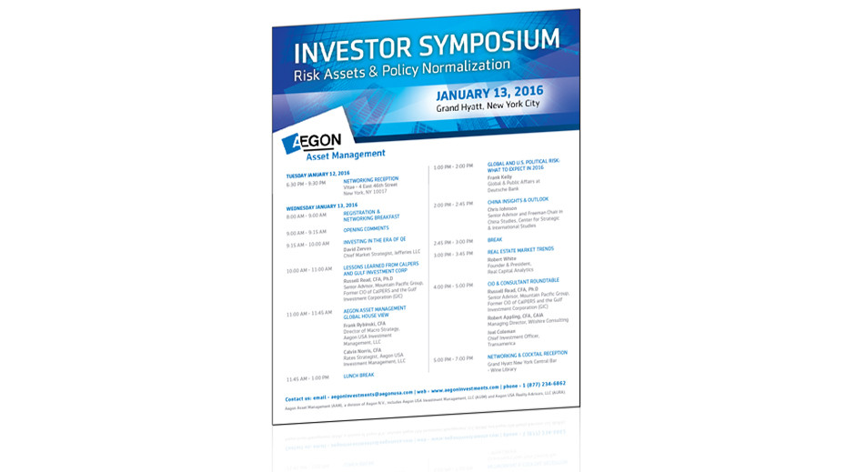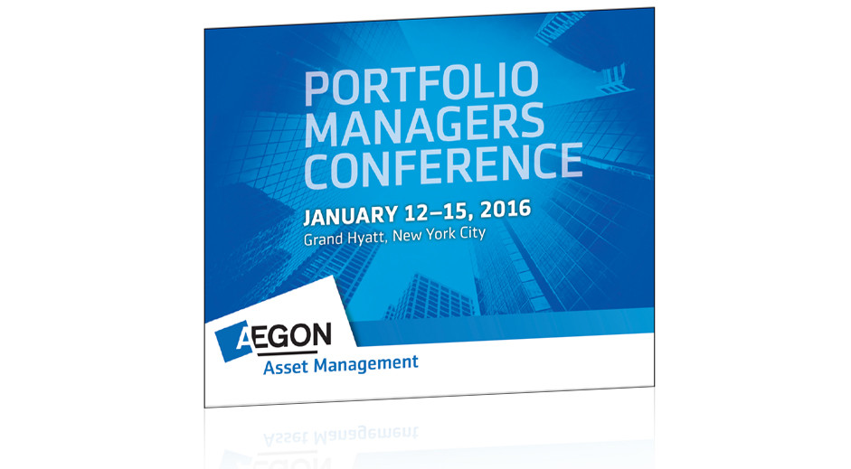 We worked with Aegon’s global sales & marketing team to create print and digital marketing materials, as well as trade show pop-up stands and banners for their 2016 Portfolio Managers Conference in New York City. After the winning design concept was chosen, we worked closely with their team to ensure everything worked within their brand standards.