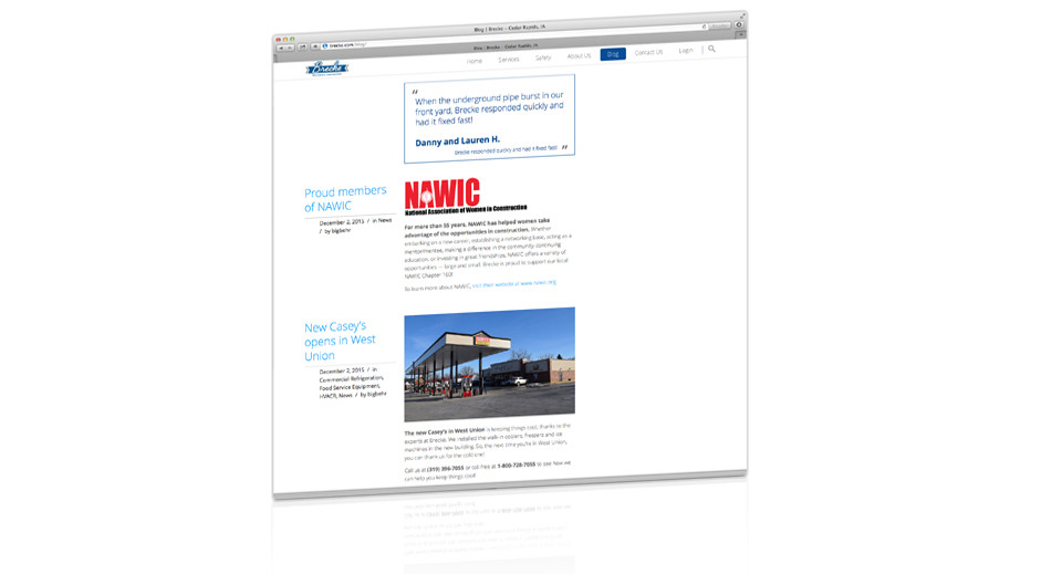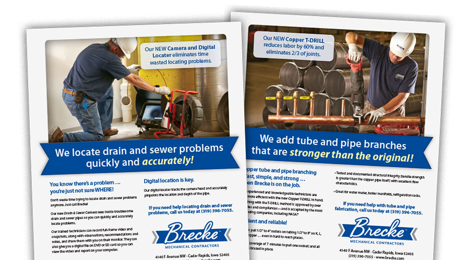 For several generations, Brecke Mechanical Contractors has built and maintained critical mechanical systems for clients in eastern Iowa and throughout the world. In anticipation of their 50th anniversary, Bob Brecke and his leadership team asked us to freshen up their brand identity and create a new, responsive website. During our Discovery Phase, we discussed a major problem with their name: over their fifty years in business, they had been known as B.G. Brecke Inc., Brecke Mechanical Contractors, and other iterations—which was causing confusion in the marketplace. We worked with them to ensure their logo and business name would be used consistently in all communications. Now their fleet of service vehicles work as traveling billboards and their website is a tremendous tool for attracting new business. We also developed new signage, clothing, sales materials, office artwork, and art directed photography for their website and other marketing materials. The website is now maintained internally, but we enjoyed giving them the tools to do the job right!