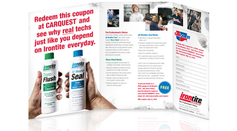 We were thrilled to help Irontite clean up their brand identity and packaging, but our big idea for their direct mail campaign with CARQUEST® was a little more gritty. When we were developing ideas for Irontite, we visited several auto repair shops to get a better feel for their target audience. We noticed there were greasy finger prints everywhere: on the phones, the keyboards, the job tickets. If they touched something, it left a mark, and that left a mark on us, too. We proposed that everything we designed for them should have greasy looking fingerprints on them—even the packaging in the store. Well, we didn’t persuade the client to put the fingerprints on the packaging, but we did leave our mark on their brand.