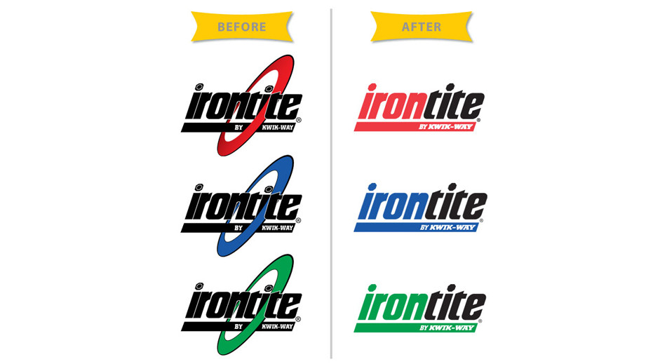 When Kwik-Way bought the Irontite company, the original Irontite logo had a red, blue, or green ring around the black Irontite wordmark and the lettering was scrunched very tightly together. Unfortunately, when the logo was reduced to a smaller size on packaging and other branding materials, the name was nearly unreadable.