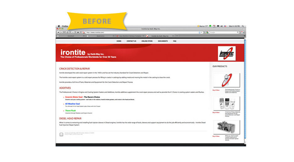 We also worked with the Kwik-Way team to redesign the Irontite website. The existing website was mostly text and used black and white photos. The navigation was very confusing. Our recommended redesign featured large, colorful photography and bold headlines. We designed the product pages with large “window shade” navigation, so the overwhelming amount of information could be compartmentalized and easily “opened” or “closed” by the user.