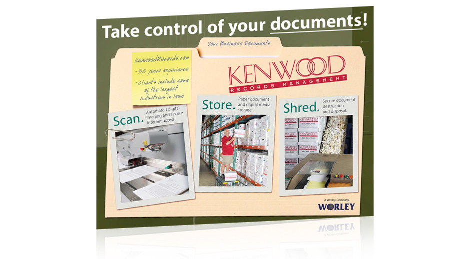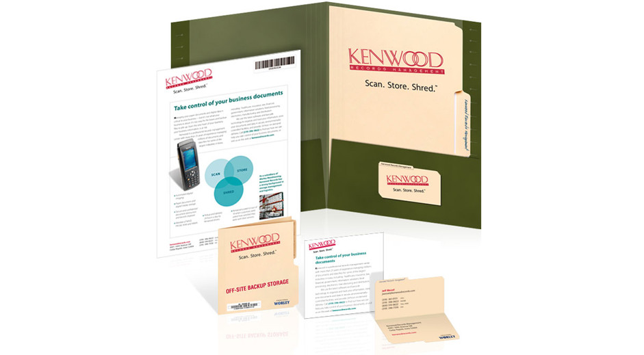 During our information gathering meetings, we noticed that even though Kenwood Records was offering modern digital scanning and storage technology, traditional manila file folders and hanging files were still what nearly every client worked with—so we made these standard office supplies the core of the new brand identity.