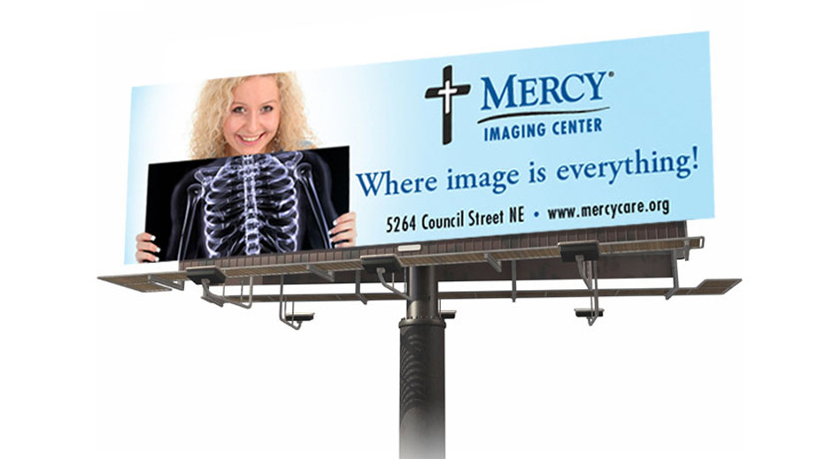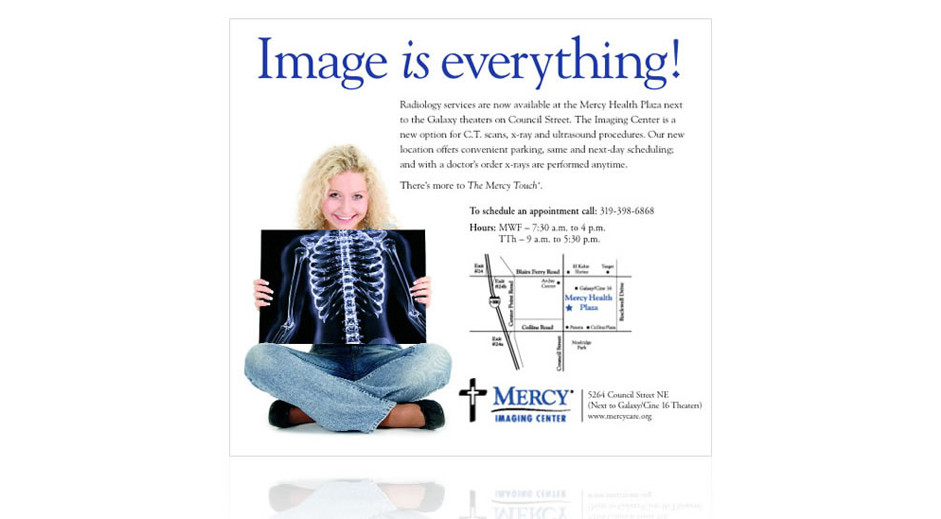 To help promote the opening of their state-of-the-art imaging Center at the Mercy Health Plaza, we changed the well known phrase “Image isn’t everything” to “Image is everything”—at least when it comes to C.T. scans, x-rays, and ultrasound procedures. We used a photo of a woman holding an x-ray in front of her body to educate viewers about what “imaging” meant.