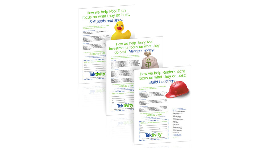 We developed a series of sales flyers that could be easily printed in-house whenever they needed them. Because the benefits of Information Technology (IT) and data services can be difficult for some people to grasp, we featured bold, colorful images to represent how Tektivity let’s businesses focus on what they do best: their business. An idea that everyone could understand.
